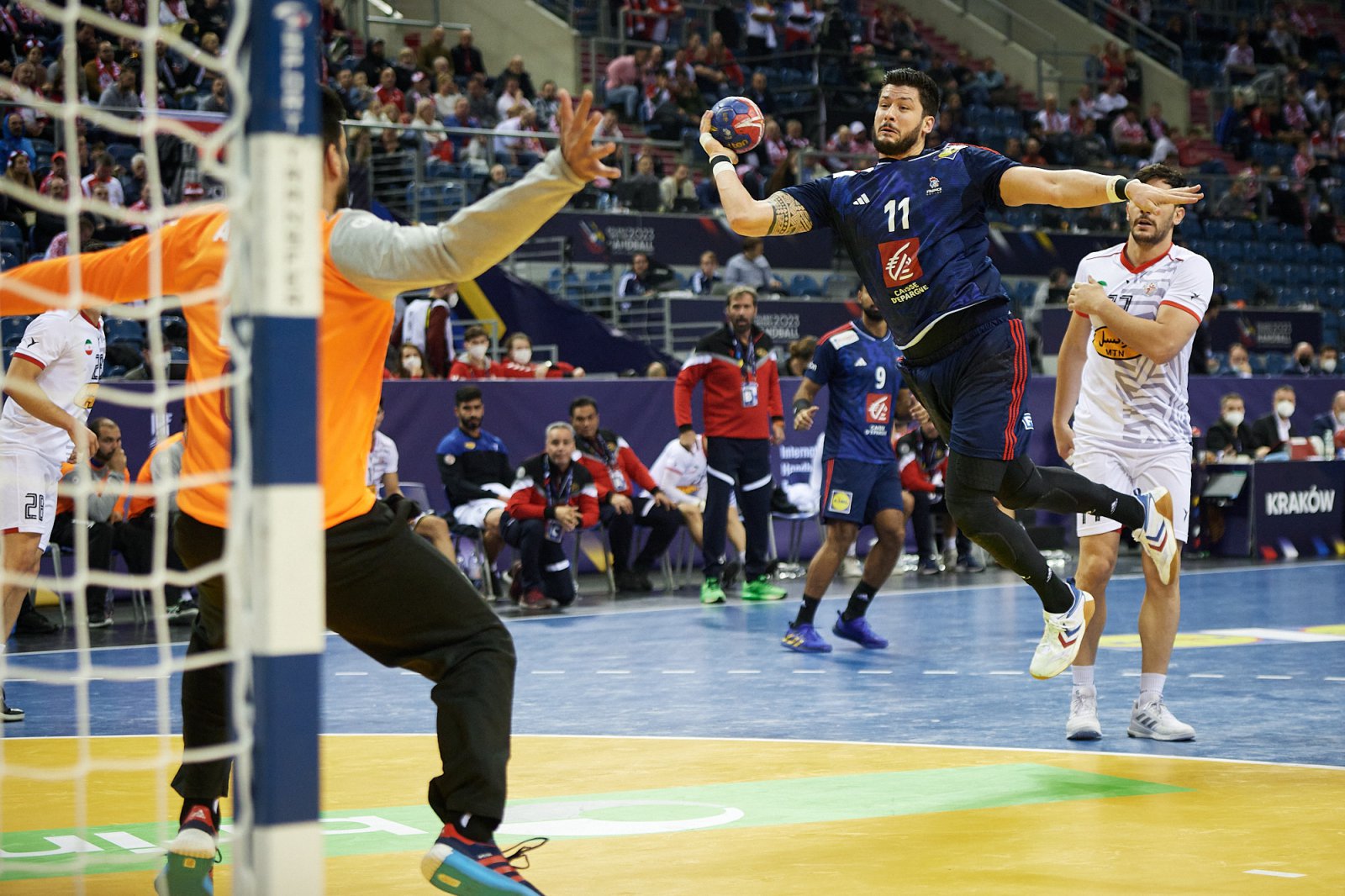 Niemcy zaczęli o wiele lepiej, Andreas Wolff bronił rzut za rzutem, a Kai Hafner, Johannes Golla czy Lukas Mertens dawali przewagę Die Mannschaft różnicą dwóch goli (5:3). Juri Knorr po chwili jednak rzucił tez na 7:4 i Niemcy zaczęli niebezpiecznie uciekać ekipie znad Sekwany. Andreas Wolff jak natchniony bronił rzuty z każdej pozycji a koledzy w ataku albo przy szybkim wznowieniu albo po mozolnie wypracowanym ataku pozycyjnym zdobywali kolejne bramki, a nie pomagał tez kompletnie Vincent Gerard.