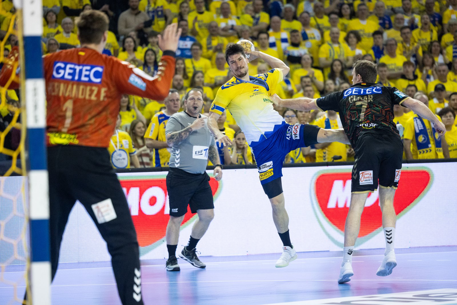 Bez niego kielczanom grało się trudniej, ale dawali radę. Po dwudziestu dwóch minutach wygrywali już 12:8. Wtedy jednak ich gra w ataku totalnie się zacięła, co wykorzystali rywale. Magdeburg odpowiedział czterema bramkami, doprowadził do remisu, a miał też szansę, aby wyjść na prowadzenie, ale na posterunku był Wolff. Złą passę przełamał dopiero Igor Karacić. Industria po pierwszej połowie miała o jedno trafienie więcej.