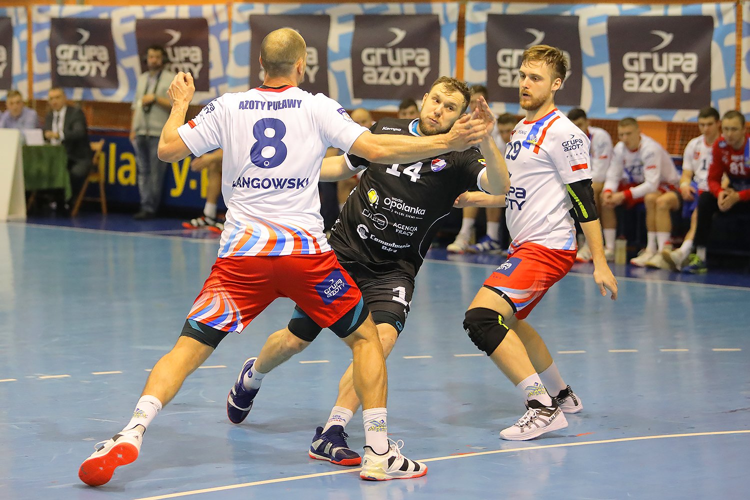 W przypadku Azotów najlepiej bronili ci, którzy imponowali z przodu - Dawydzik, Łangowski, Podsiadło. Zwłaszcza dwójka rozgrywających szczelnie broniła drogi do Patryka Mauera, przez co skrzydłowy nie mógł liczyć na wsparcie. Opolskie szyki trzymają, jak zwykle niezmordowany Jankowski oraz dwanaście lat od niego młodszy Dariusz Skraburski. Często widać jak kapitan instruuje młodszego kolegę, jednak przyznać trzeba, że świetnie współpracują na środku obrony, ograniczając korytarze ewentualnych podań.