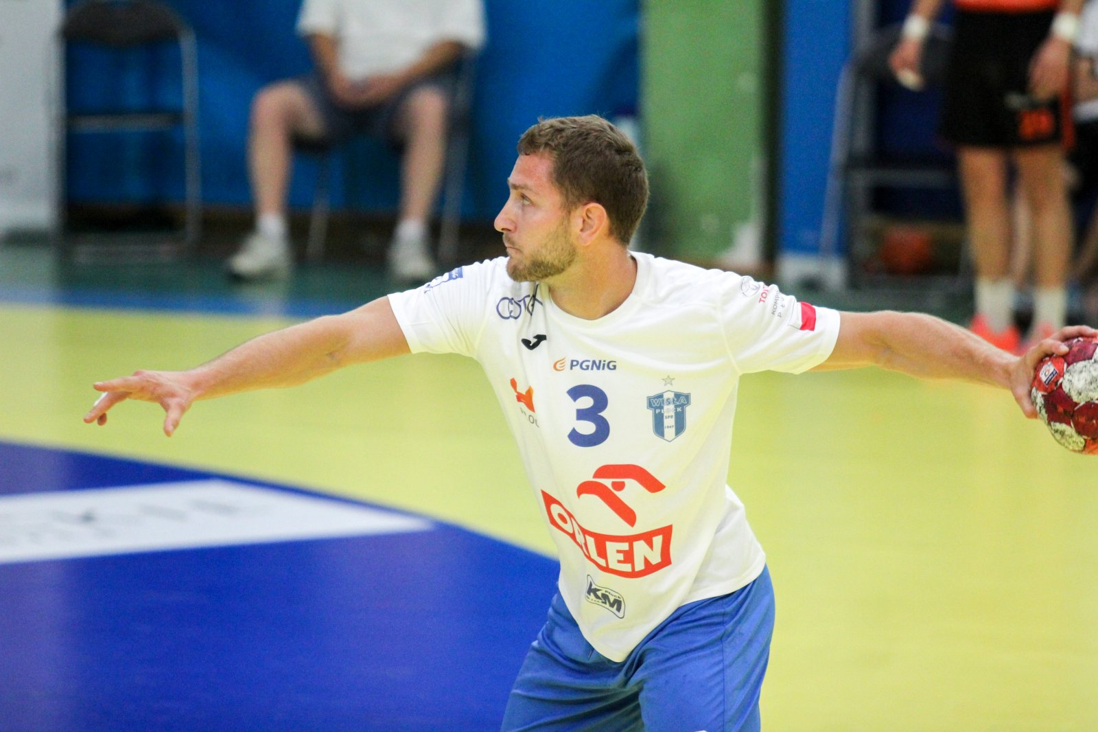 Jednak od początku spotkania nie było widać w zespole z Piotrkowa niepewności, wynik meczu otworzył Marcin Tórz. Później oglądaliśmy zacięte i wyrównane spotkanie. Orlen Wisła tuż przed przerwą odskoczyła na cztery trafienia, ale po trafieniach Mateusza Kaźmierczaka i Patryka Mastalerza ich przewaga po pierwszej połowie wynosiła dwie bramki.